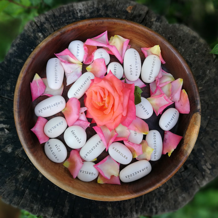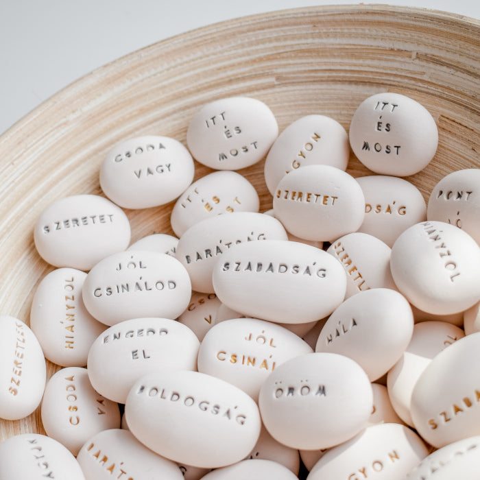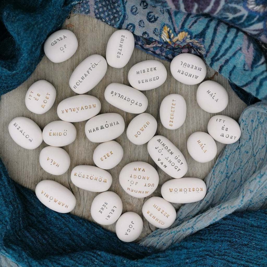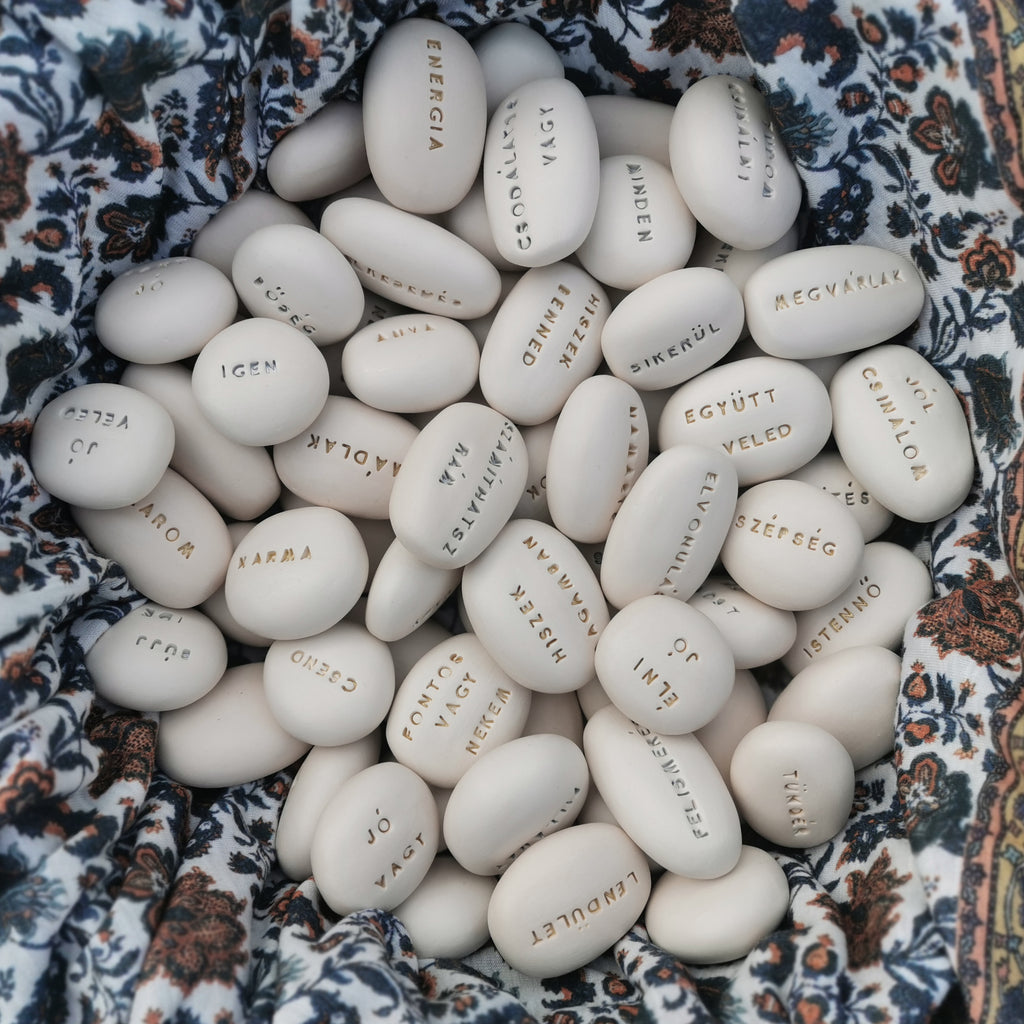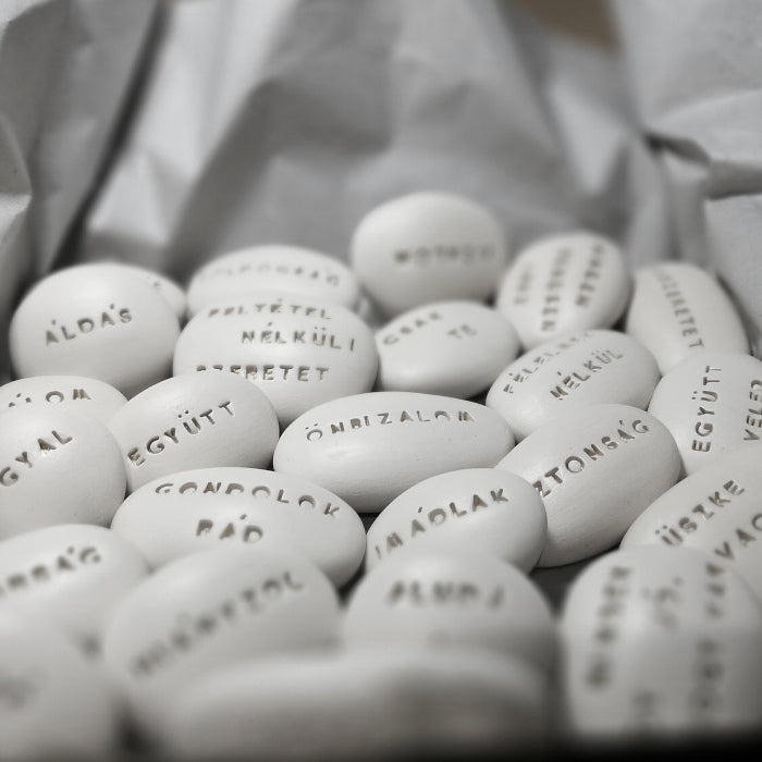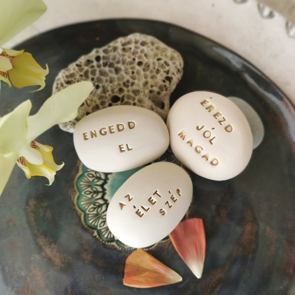 The packages contain 3 different hand-shaped, inscribed Magic Pebbles with the following messages in hungarian: