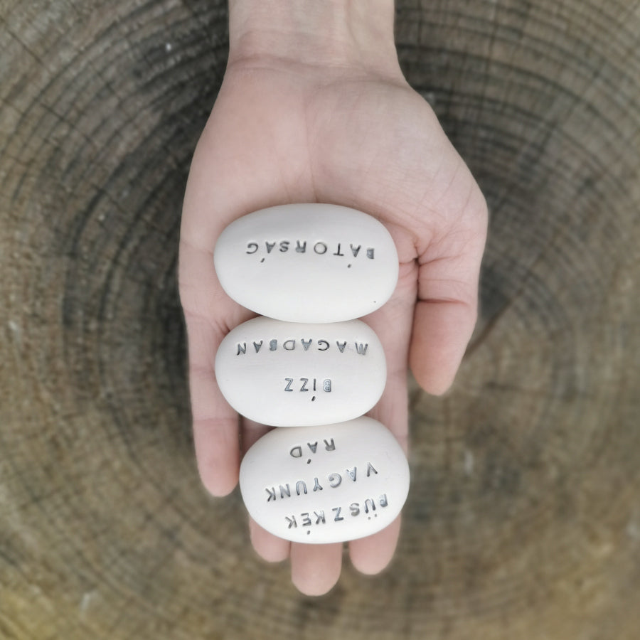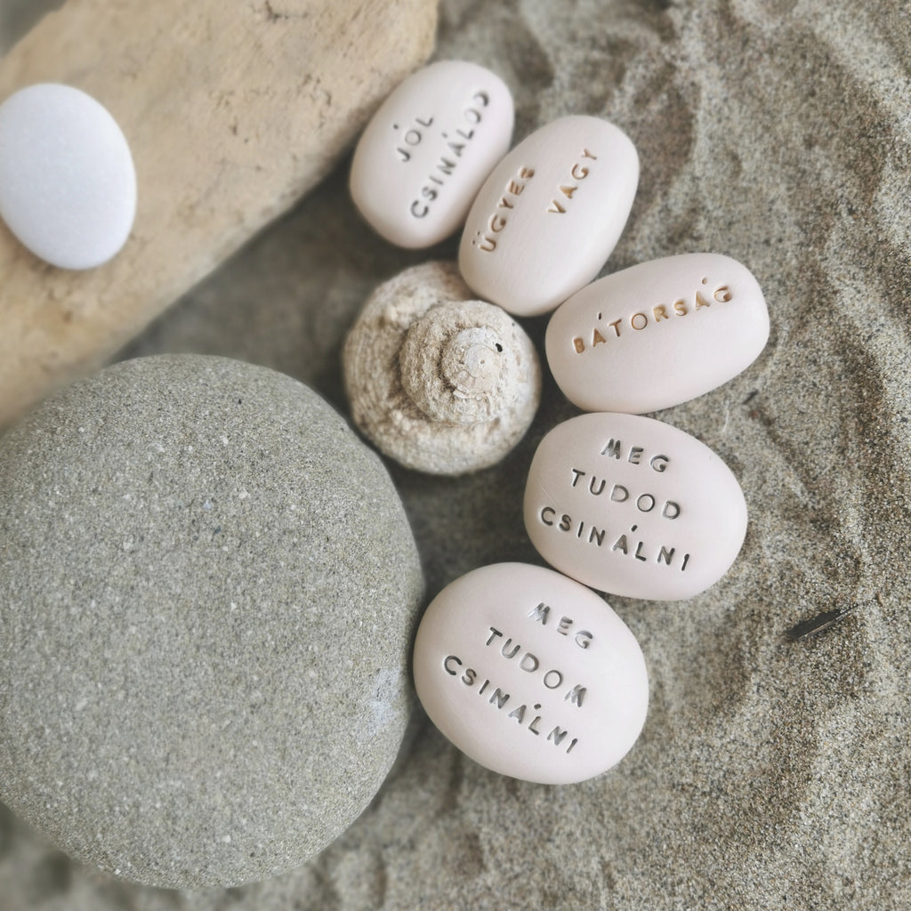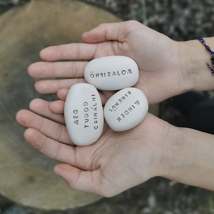 The packages contain 5 different hand-shaped, inscribed Magic Pebbles with the following messages in hungarian: