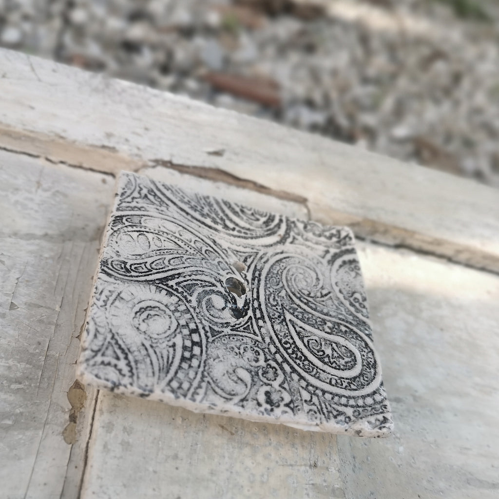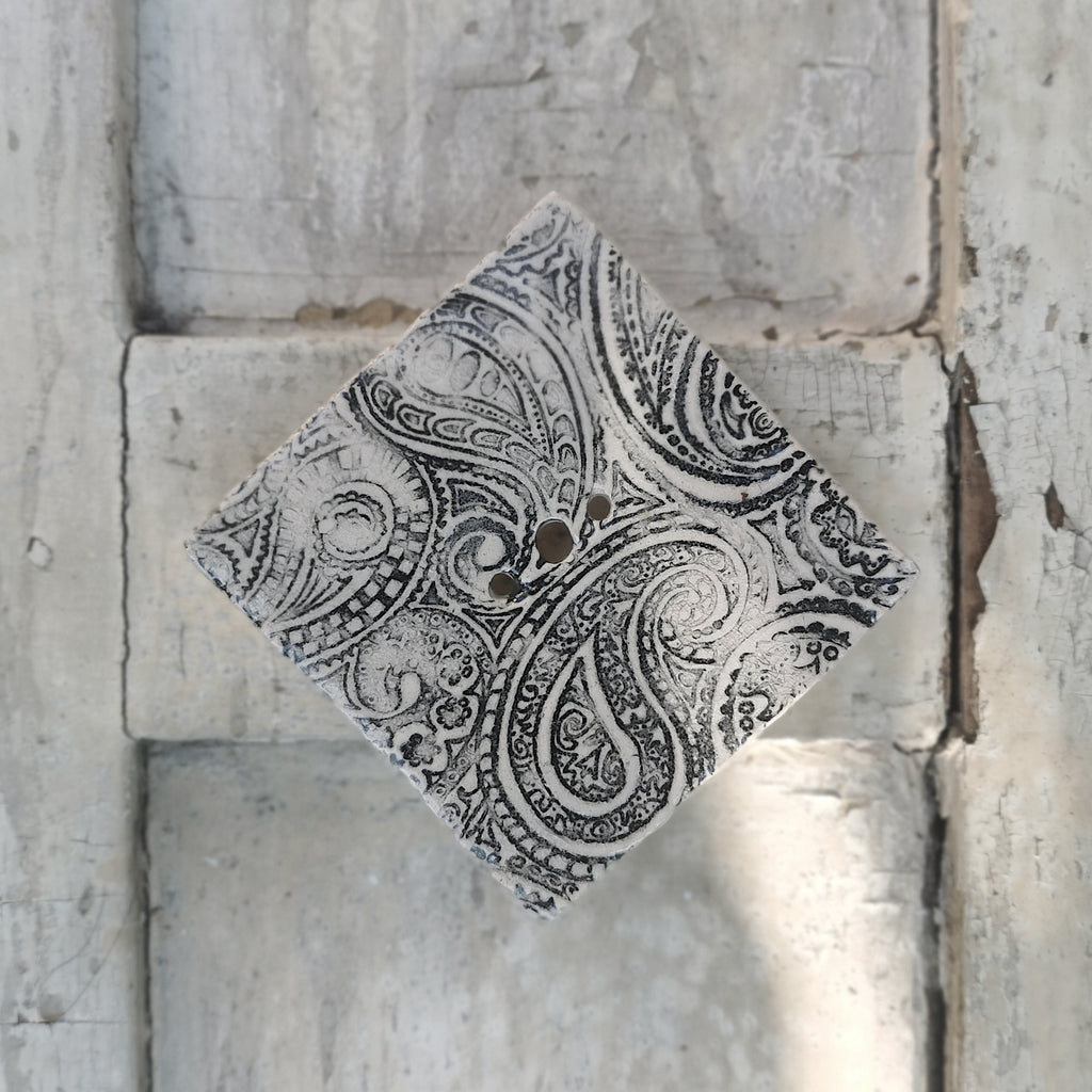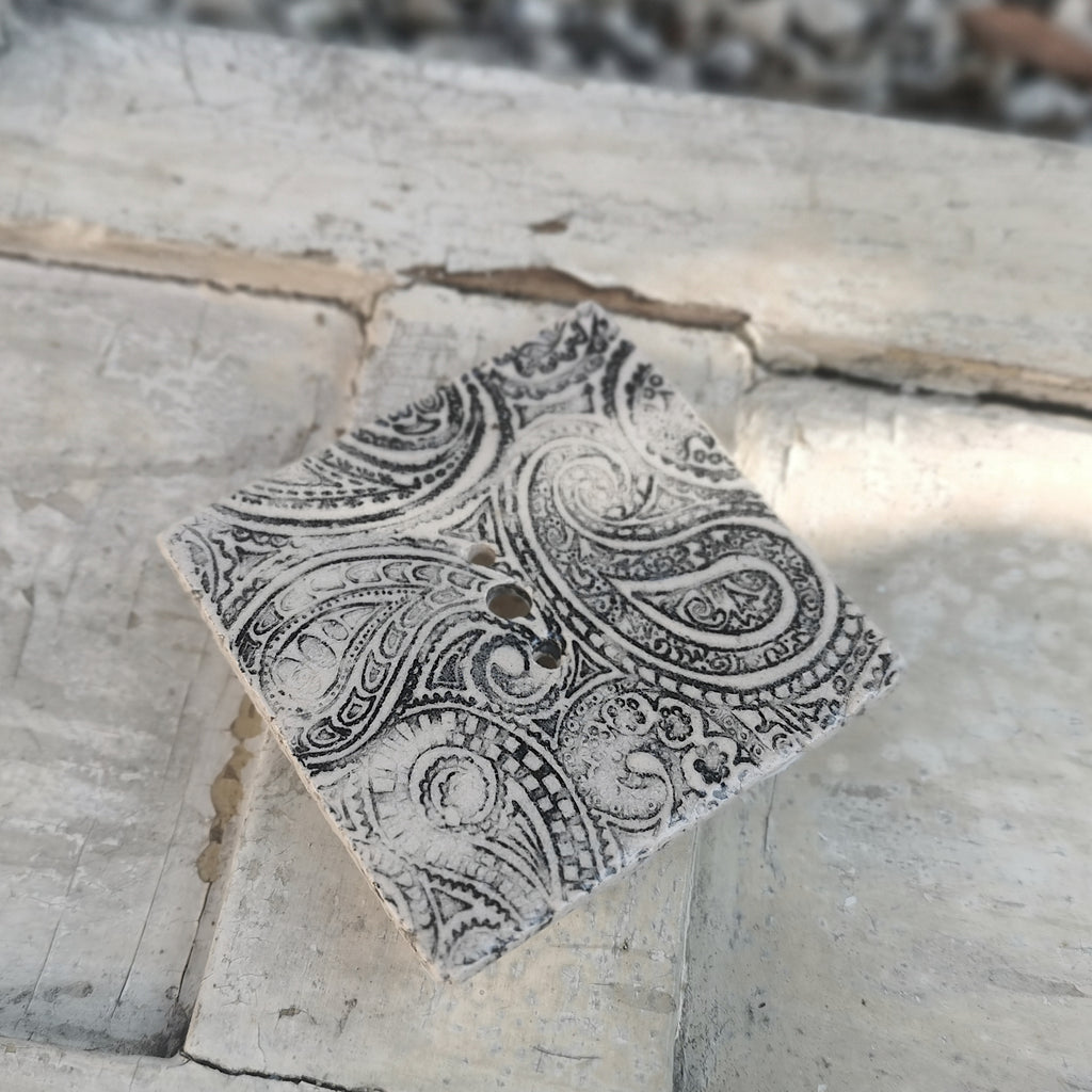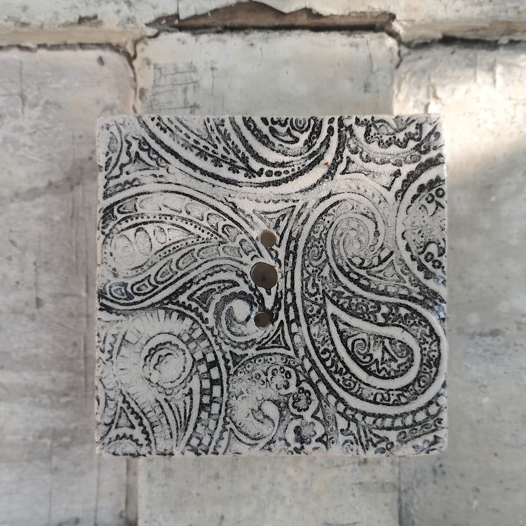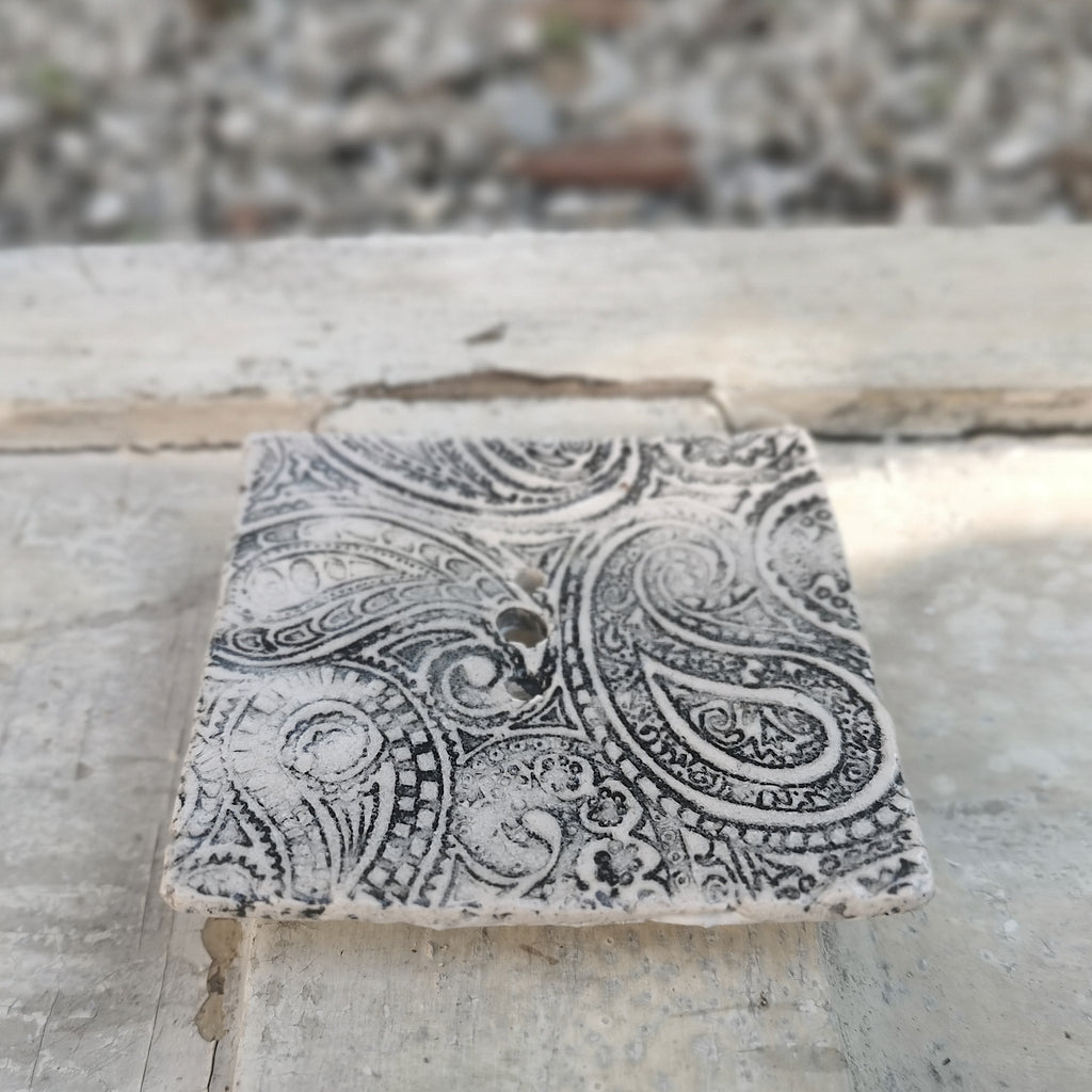 This handmade glazed ceramic soap dish with pressed patterns can be a wonderful accessory in your bathroom in cream and black color.