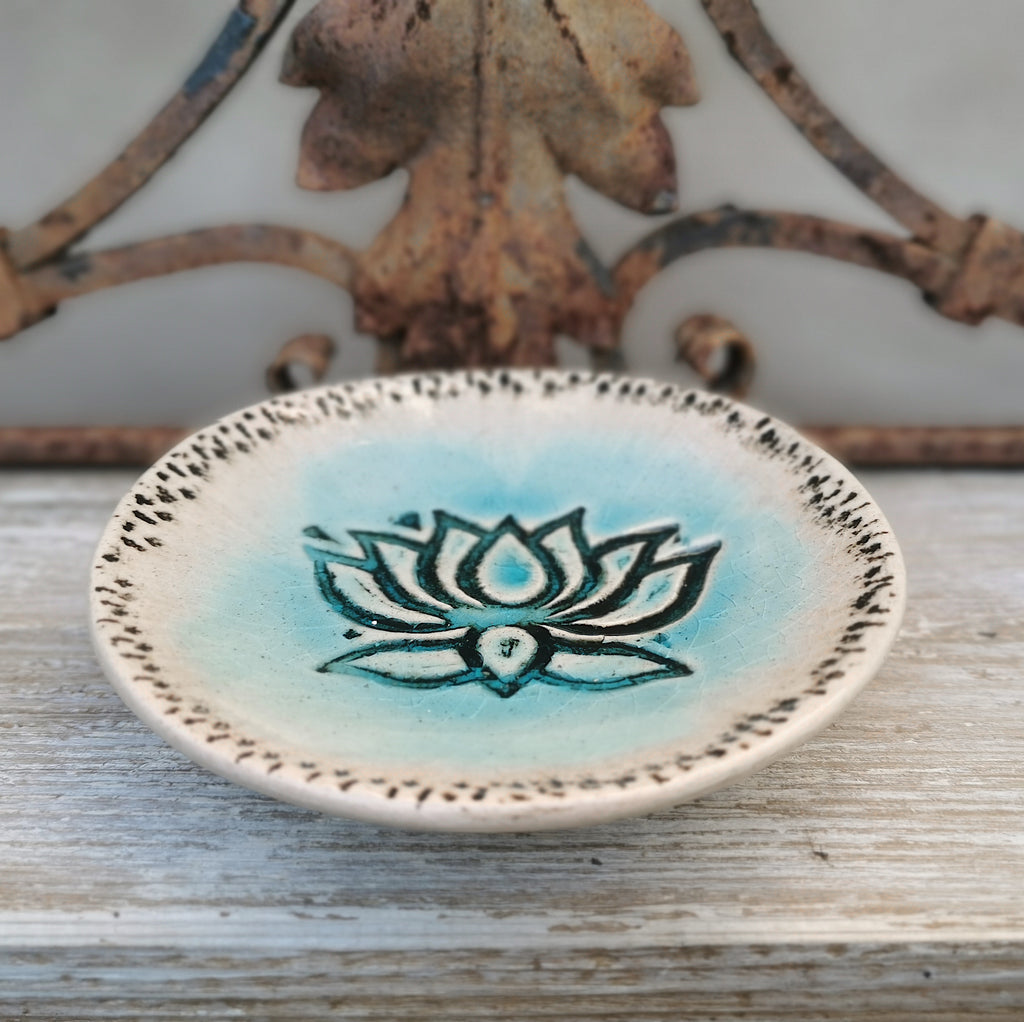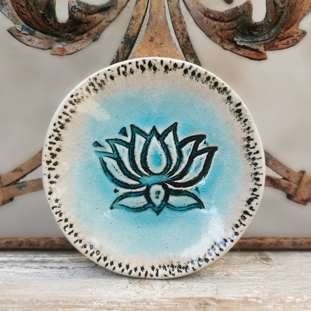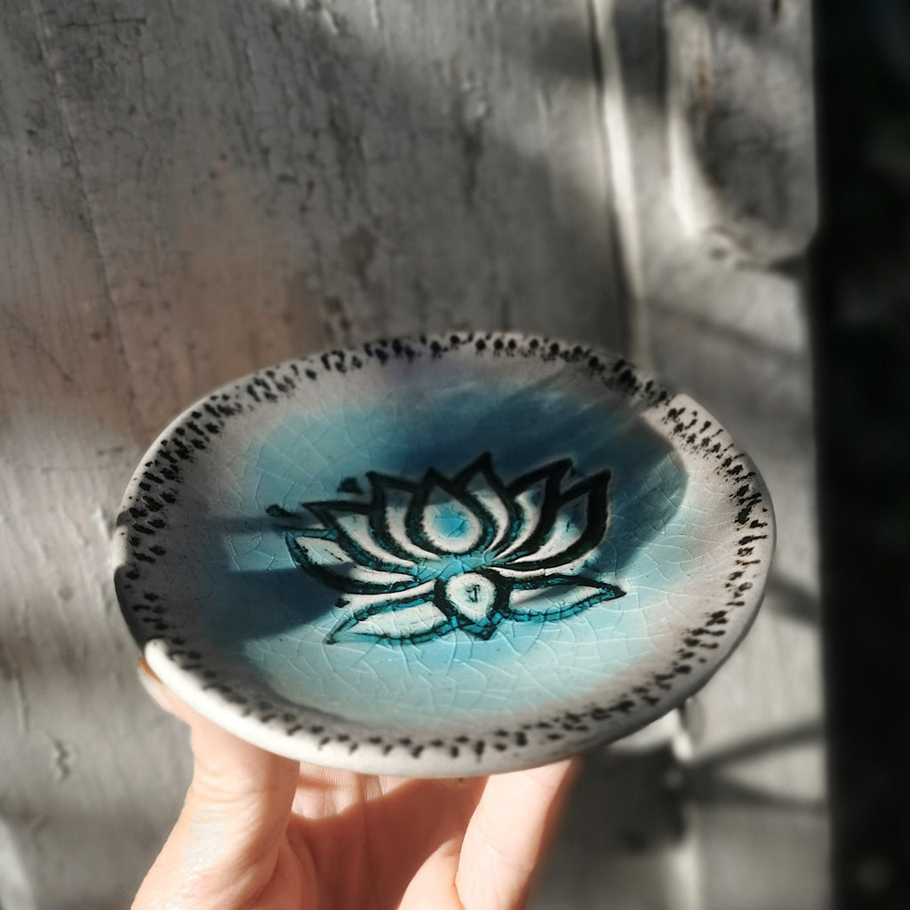 Special ceramic bowl covered with turquoise glaze with lotus flower that you can use in your kitchen, or bathroom as well.